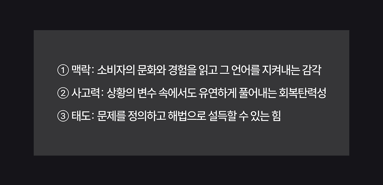 결국, 함께 일하고 싶은 디자이너는 단순히 완벽한 결과물을 만드는 사람이 아닙니다. 중요한 건 그 디자인이 어떤 문제에서 출발했고, 그 과정에서 무엇을 고민하며 어떻게 해결했는지를 스스로 설명할 수 있는 힘이죠. 눈길을 사로잡는 비주얼보다, 문제를 정의하고 해법으로 이끌어 가는 사고의 흐름과 설득력이 훨씬 더 가치 있습니다. 브랜딩은 결국 이미지가 아니라 브랜딩 전략과 브랜딩 프로세스 위에서 ‘설득’으로 완성되는 일이니까요.