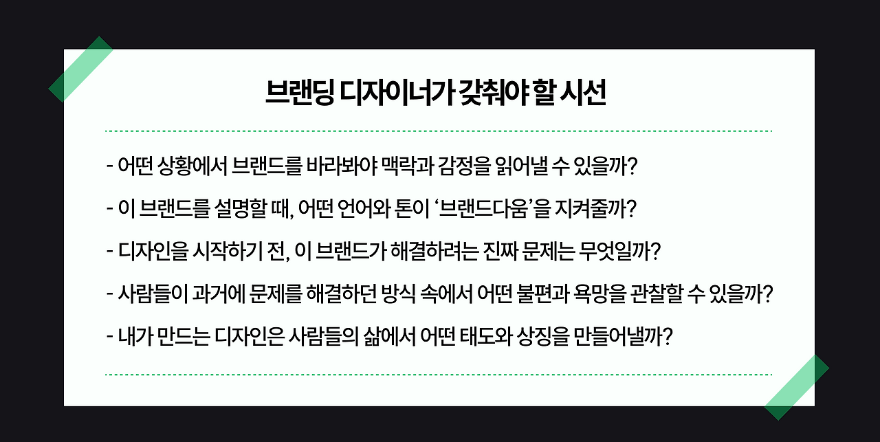 - 결국 좋은 브랜드 디자인은 디테일에 담긴 맥락에서 나옵니다. 단어 하나, 색 하나에도 의도를 담아야 하고, 그 의도가 소비자의 경험과 이어질 때 비로소 설득력을 얻습니다.