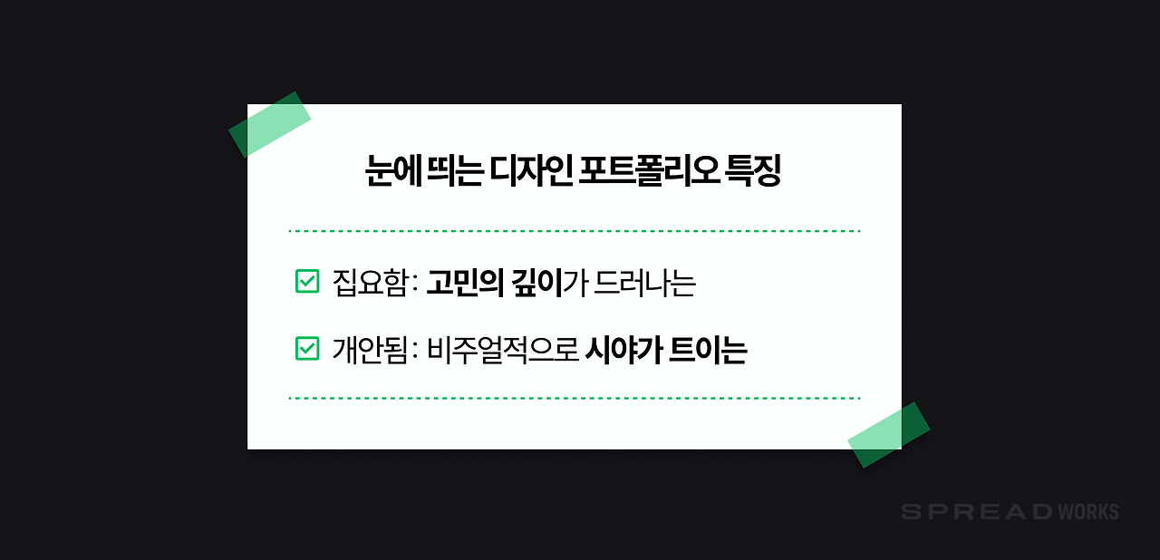 결국 디자이너의 관찰력과 시선이 작업물에 담겨야 합격하는 디자인 포트폴리오가 됩니다. 하지만 아무리 감각이 뛰어나고 많은 것을 봐왔더라도, 그걸 ‘자기 작업 안에 어떻게 잘 녹여냈느냐’는 또 다른 이야기죠. 이번 챕터에서는 스프레드웍스에 합격했던 디자인 포트폴리오와 그렇지 않았던 포트폴리오의 차이를, 각각 세 가지 포인트로 정리해보겠습니다.